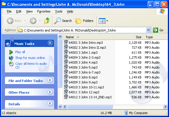 The quickest way to begin playing them in order is to click the Play all button on the left of the window. If this Play all button is not available, you must tell your audio player where the files are stored. You can use the generic mp3 player on your computer such as Window Media Player. I personally use the Real Player. Whichever player you use, open it and go to the Library. Then move it to one side and go back to the window where all your files have just been stored. I would suggest you highlight them all by pressing Ctrl A and then drag them all onto your favourite audio player. Now make sure they are in the proper file order, and if not, click on the column heading called Name. To start playing, double click on the first file and enjoy Dr. McGee's insights into God's word. |